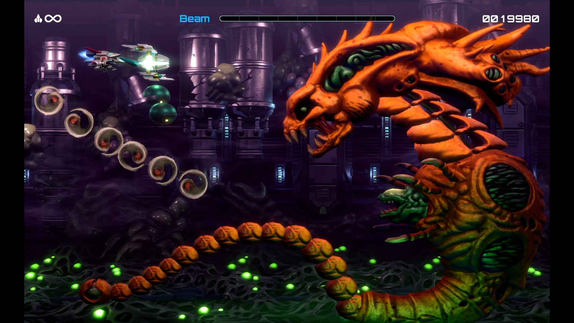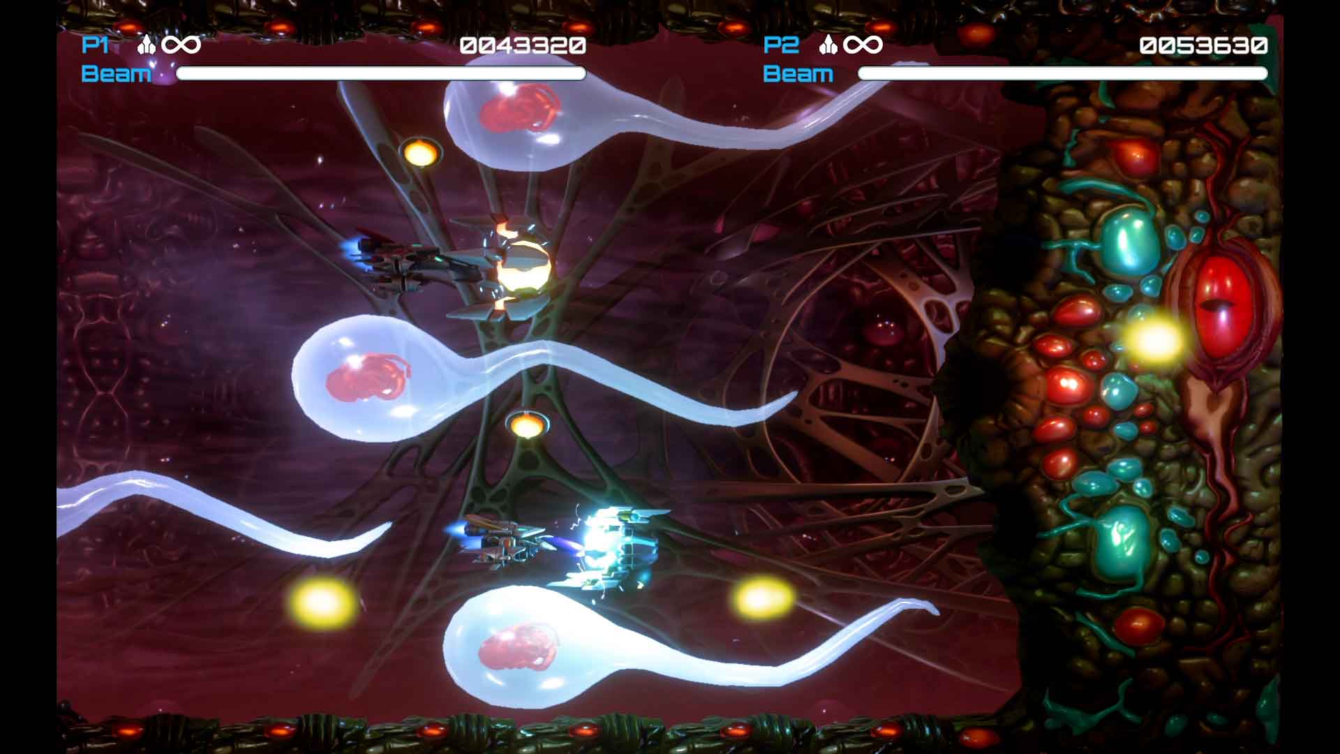 オフラインでは2人同時プレイが可能! 2機のR-9Øに、3種類のフォースがもたらす戦略。まだ見ぬR-TYPE IIIがここにある!